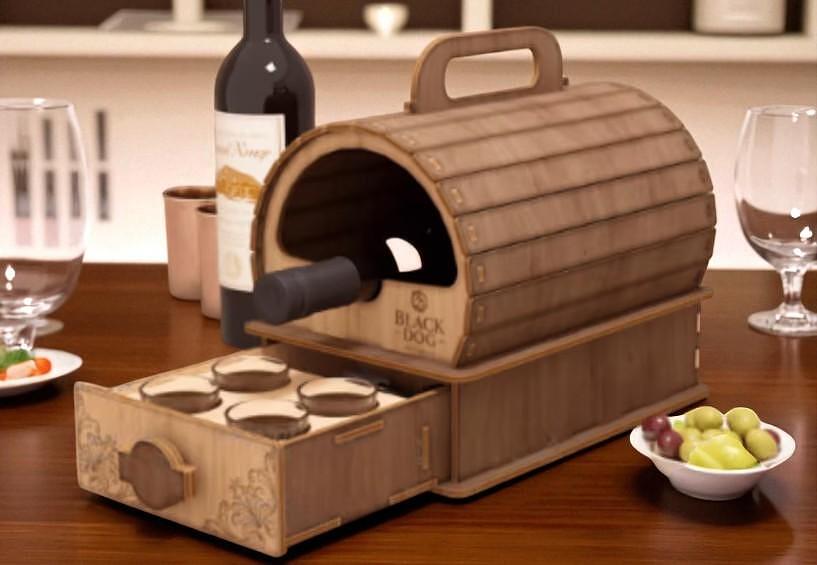 Oferă un cadou unic și elegant cu acest butoiaș din lemn pentru vin, realizat manual, prevăzut cu sertar pentru accesorii și pahare.