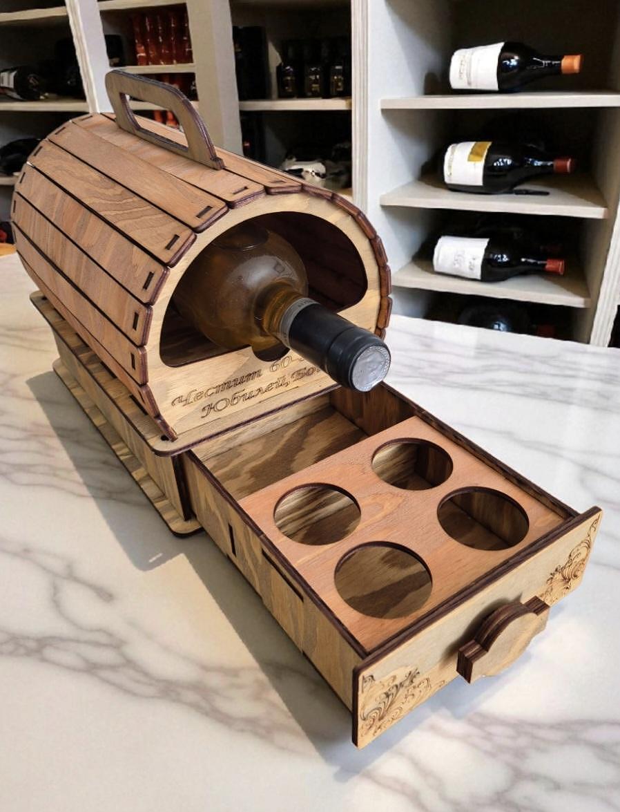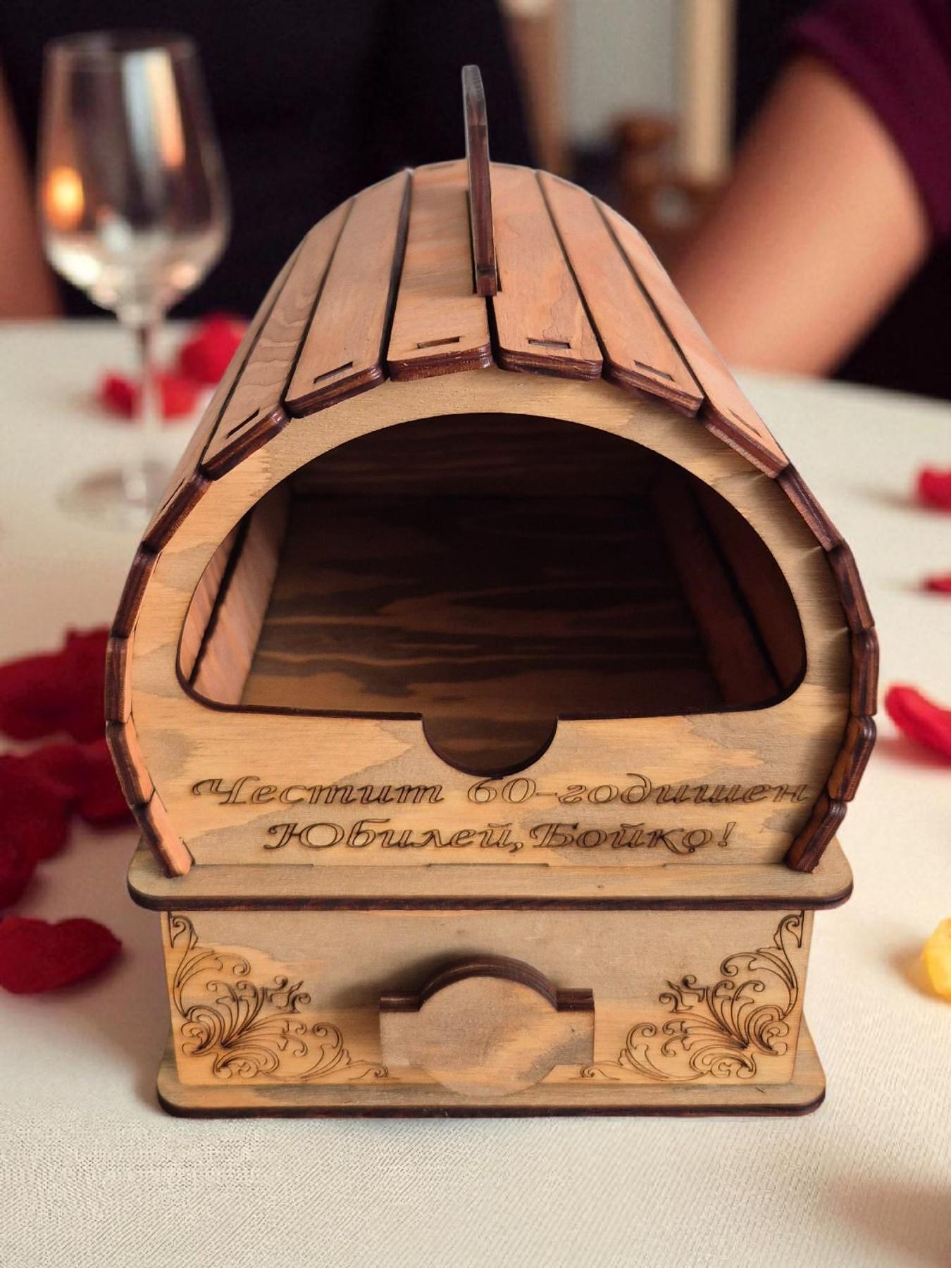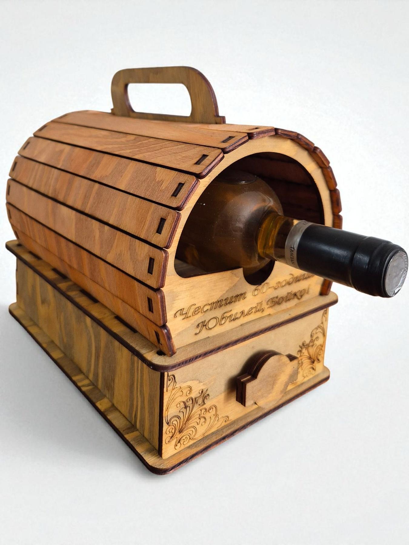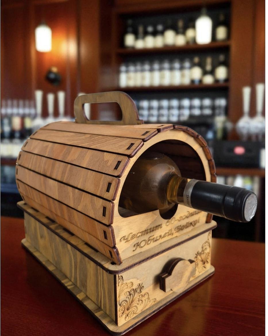 Butoiaș din lemn pentru vin cu sertar – personalizat, lucrat manual