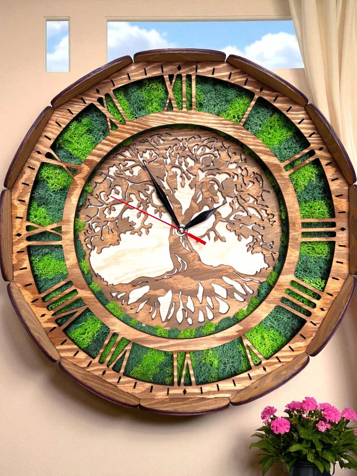 Ceas de perete din lemn „Arborele Vieții” cu mușchi scandinav natural