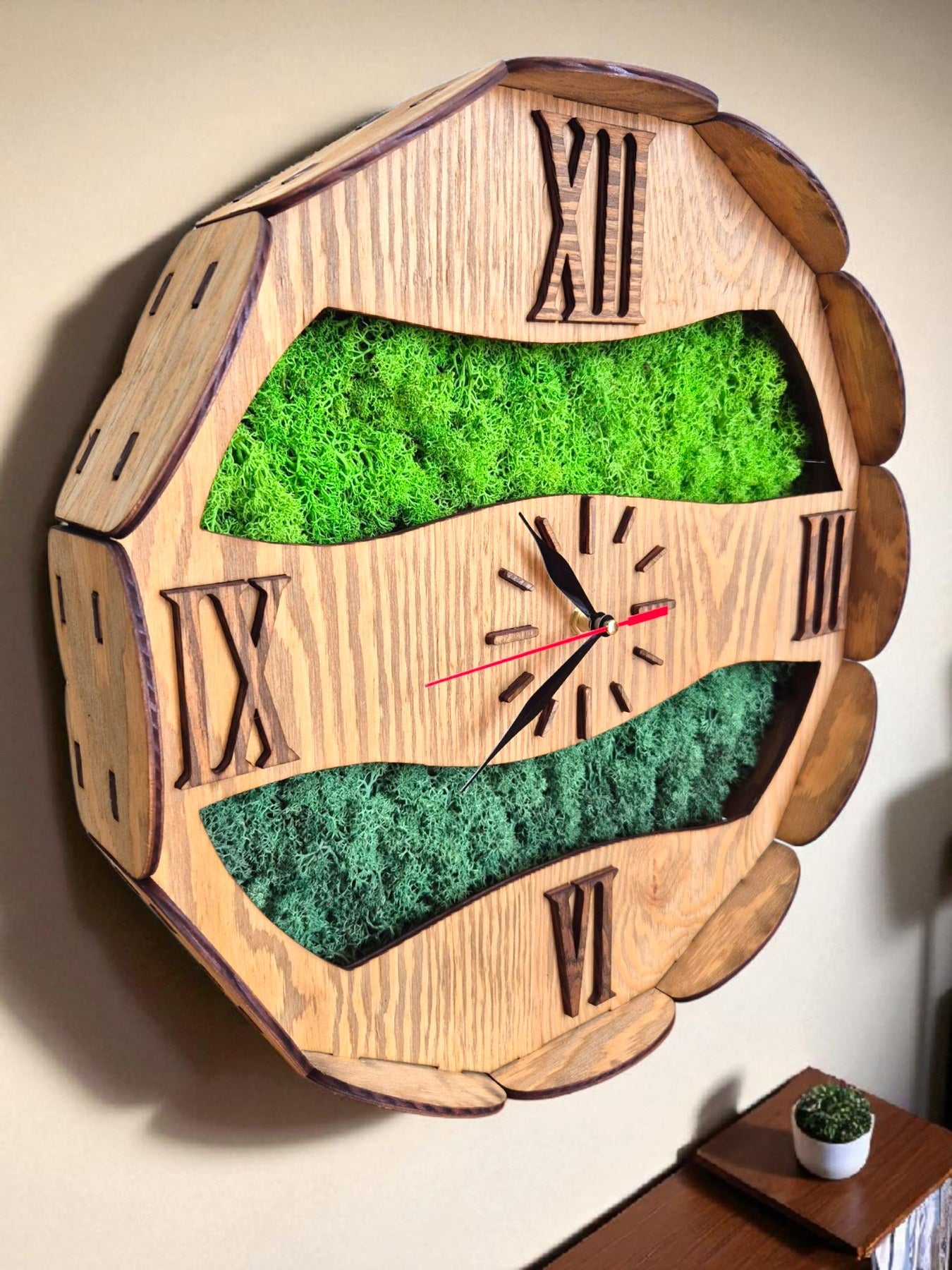 Ceas de perete din lemn „Green Harmony” cu mușchi scandinav stabilizat – lucrat manual