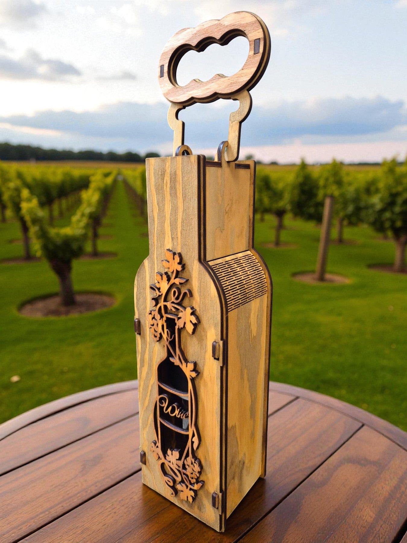 Confecționată din lemn natural de înaltă calitate, cutia are elemente decorative fine, decupate cu laser, în formă de viță de vie și struguri, oferind un aspect sofisticat și vintage.