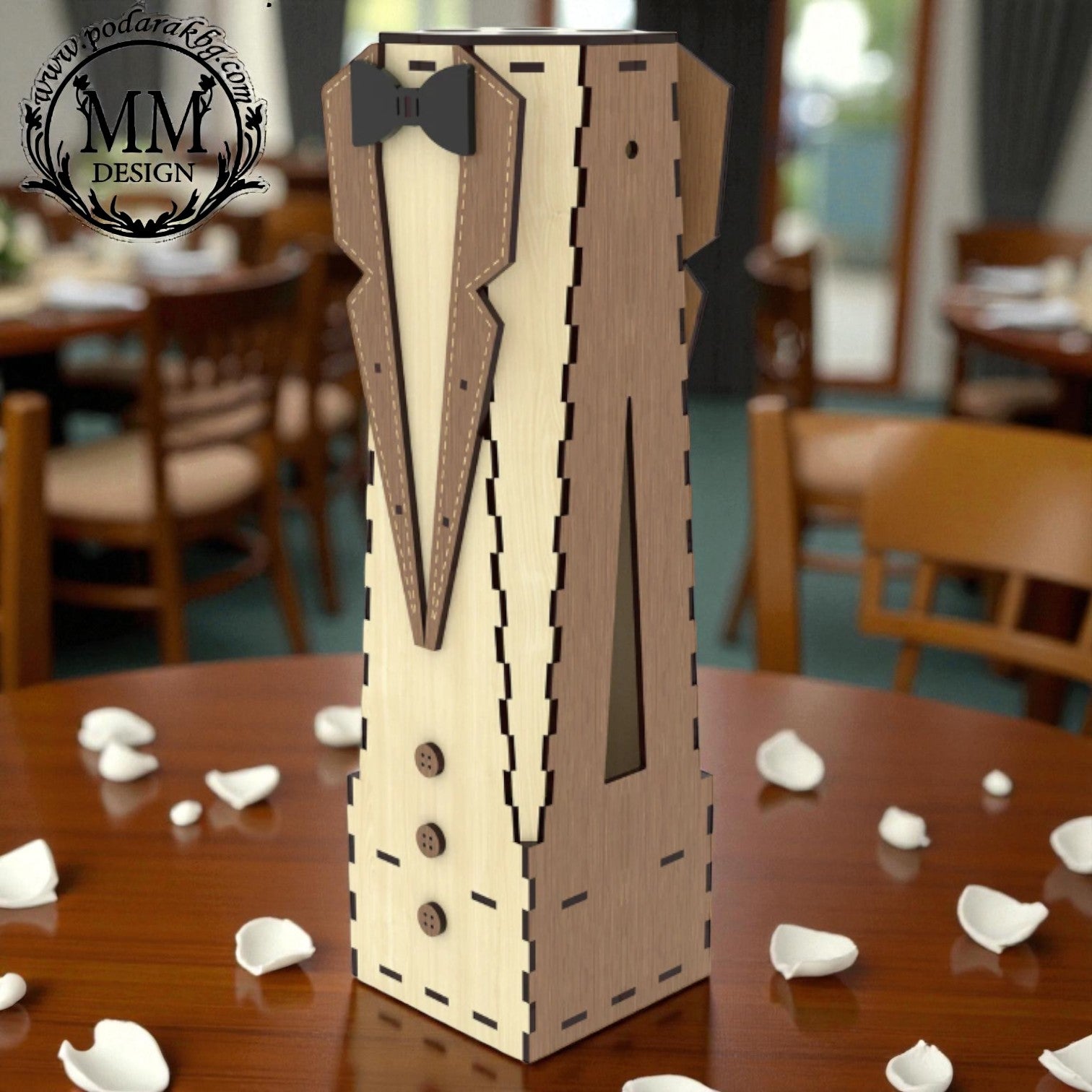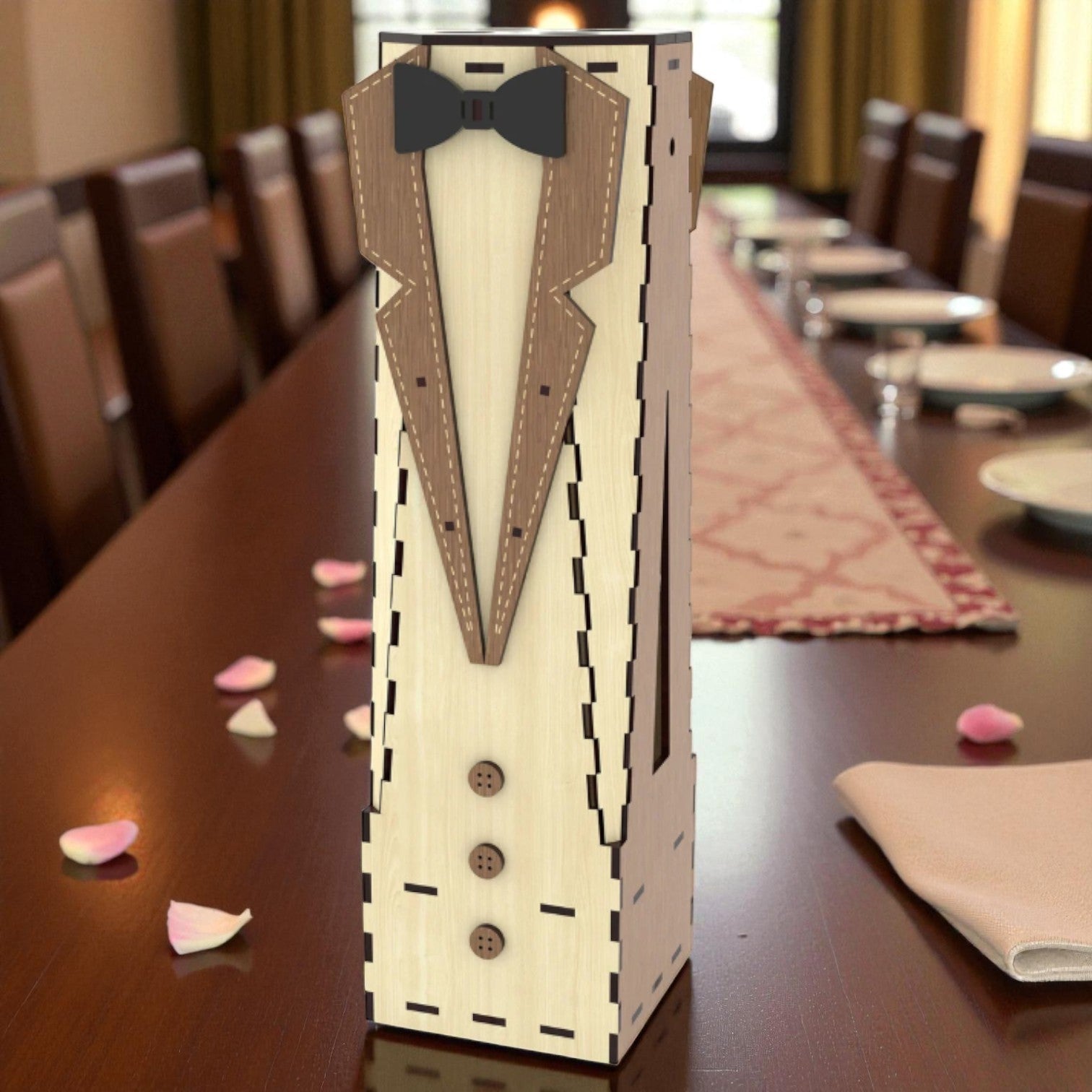 Această cutie elegantă pentru sticlă de vin este realizată manual din lemn de înaltă calitate și impresionează prin designul său unic în stil smoking, care oferă un aspect premium și rafinat oricărui cadou.