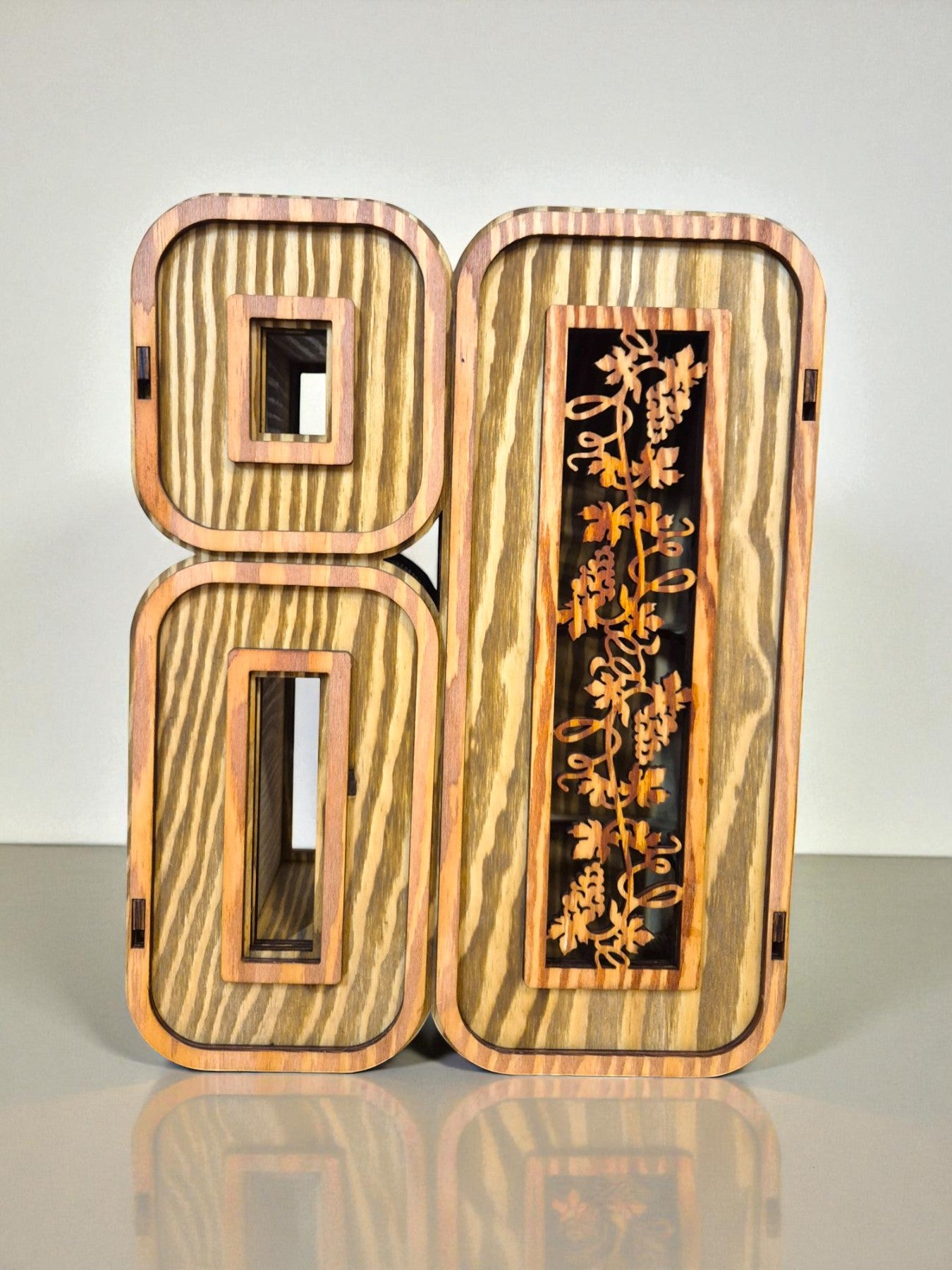 Surprinde o persoană dragă cu ocazia celor 80 de ani de viață – un moment unic, plin de emoție și amintiri – prin această cutie elegantă din lemn, lucrată manual, în forma numărului 80. Un cadou simbolic, ce exprimă respect, admirație și recunoștință. 💛