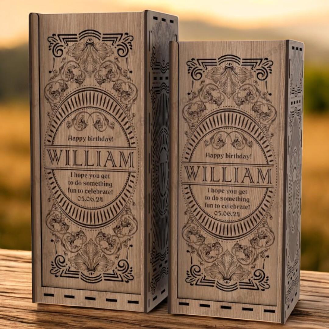 Prezentăm o cutie din lemn elegantă pentru sticla de whisky Jack Daniel’s, realizată manual și personalizată prin gravură fină.