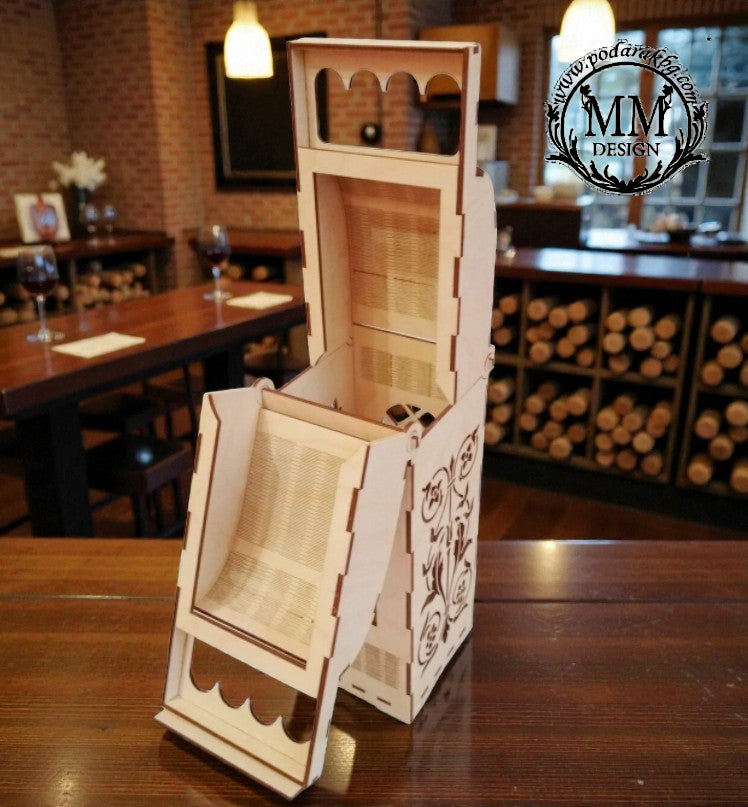 Cutia este potrivită pentru o sticlă standard de vin și dispune de un design stabil, cu mâner practic pentru transport. Datorită opțiunii de gravare la alegere – nume, dată, ocazie sau un mesaj scurt – fiecare produs devine un cadou unic și personal.