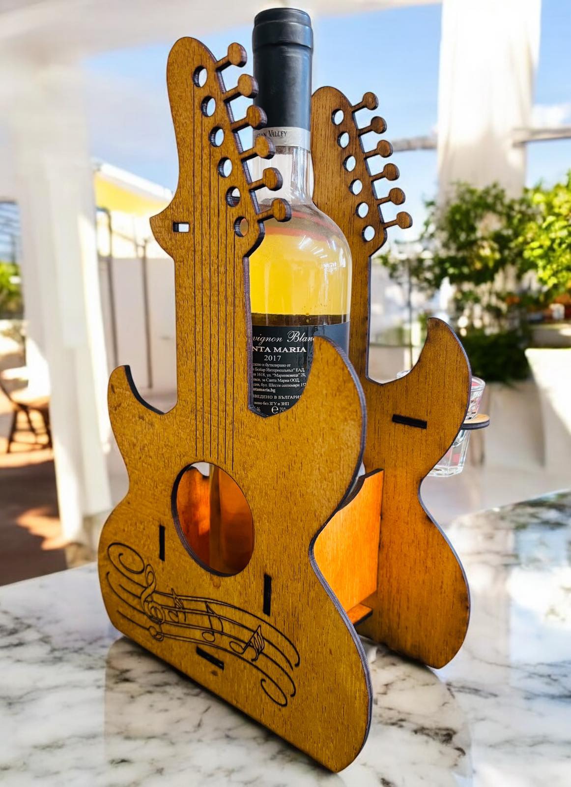 Acest mini bar din lemn, lucrat manual în formă de chitară, este o bijuterie decorativă perfectă pentru iubitorii de vin, muzicieni, chitariști sau profesori de muzică.