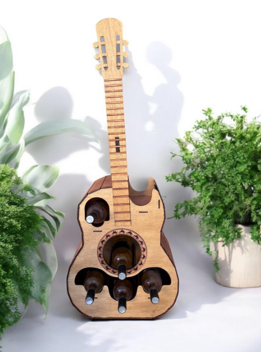 Mini bar din lemn în formă de chitară – suport pentru 5 sticle și pahare, personalizat