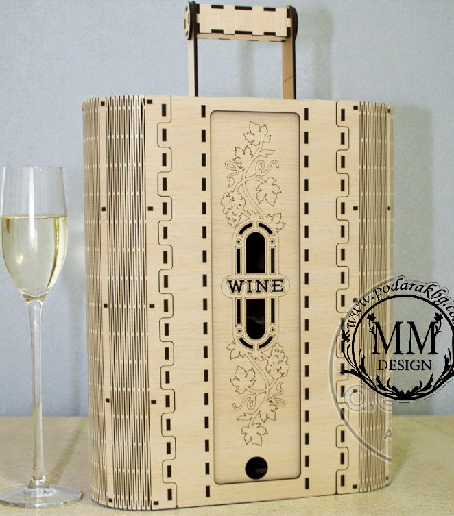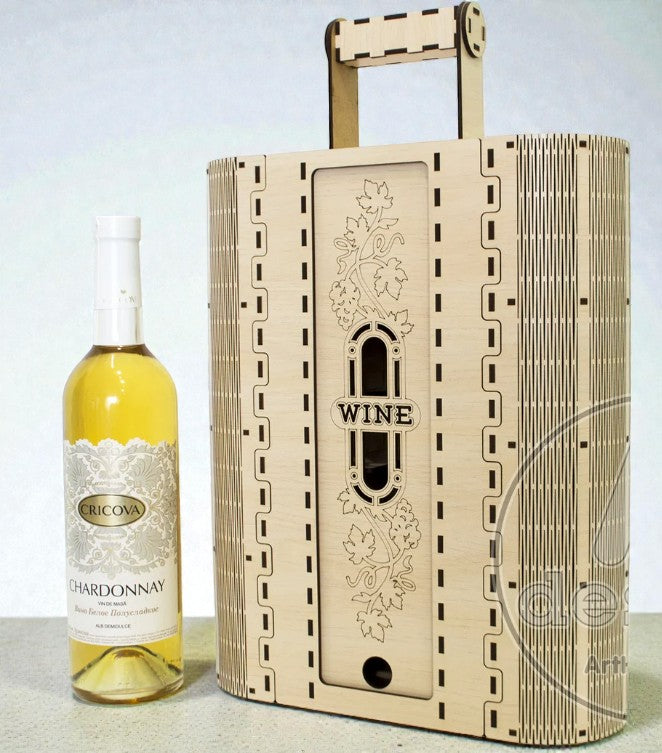 „Eleganță Vin” este o cutie din lemn, realizată manual, destinată unei sticle de vin și două pahare, creată pentru a oferi un aspect elegant și reprezentativ oricărui cadou. Fabricată din lemn natural și decorată cu elemente atent decupate, aceasta îmbină funcționalitatea, durabilitatea și posibilitatea de personalizare.